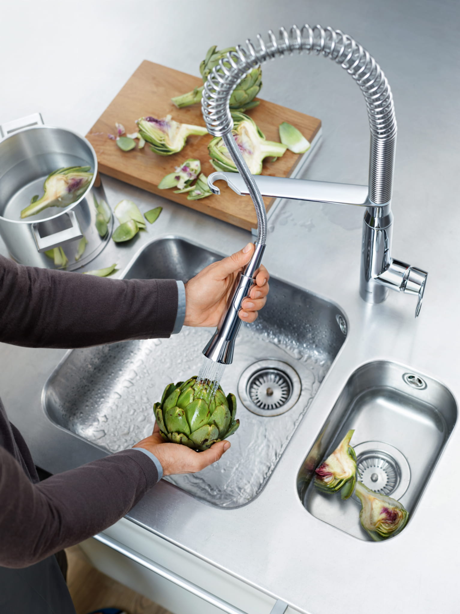 Projektując baterię zlewozmywakową K7, inżynierowie GROHE współpracowali z najlepszymi szefami kuchni na całym świecie. Zaowocowało to stworzeniem niezwykle funkcjonalnej i eleganckiej armatury, która sprosta nawet najtrudniejszym kulinarnym wyzwaniom. Wyposażono ją w szeroki kąt obrotu 140° i sprężynową wylewkę. Możesz ją swobodnie wyciągnąć z uchwytu i przełączyć na strumień prysznicowy, by jeszcze łatwiej napełnić duże garnki wodą, albo przepłukać zlew. Dzięki ceramicznej głowicy SilkMove® zyskujesz gwarancje, że obsługa dźwigni zawsze pozostanie lekka i precyzyjna, nawet po wielu latach intensywnej eksploatacji. Nie musisz także obawiać się, że powierzchnia baterii straci blask. Pokryliśmy ją chromowaną powłoką StarLight® która pięknie lśni, zapewniając jednocześnie odporność na zarysowania i inne uszkodzenia mechaniczne. Jest również bardzo łatwa w czyszczeniu – wystarczy przetarcie wilgotną ściereczką, by armatura znów wyglądała jak nowa. Postaw na najwyższą jakość i odkryj nowy poziom funkcjonalności w kuchni z GROHE K7.