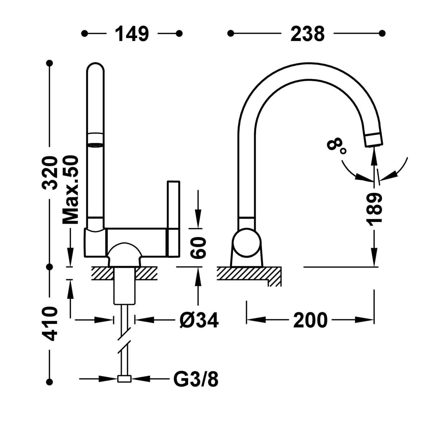 - Wężyki elastyczne G3/8.· Całkowita wysokość z opuszczoną wylewką 6 cm