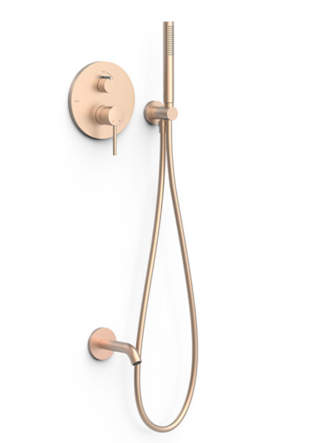 Bateria podtynkowa TRES STUDY Rapid-Box z wylewką i zestawem natryskowym matowe różowe złoto 26228006OPM