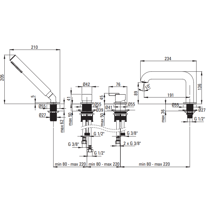 Bateria wannowa 4-otworowa z zestawem prysznicowym