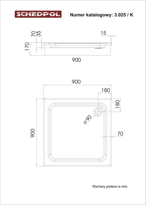 Brodzik kwadratowy SCHEDPOL GRANDO 90x17cm, biały 3.025