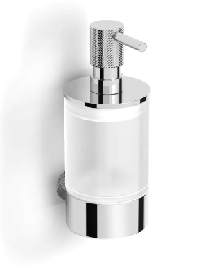 - Pojemnik na mydło w płynie wykonany ze szkła matowego, osadzony w uchwycie za pomocą uszczelki z tworzywa