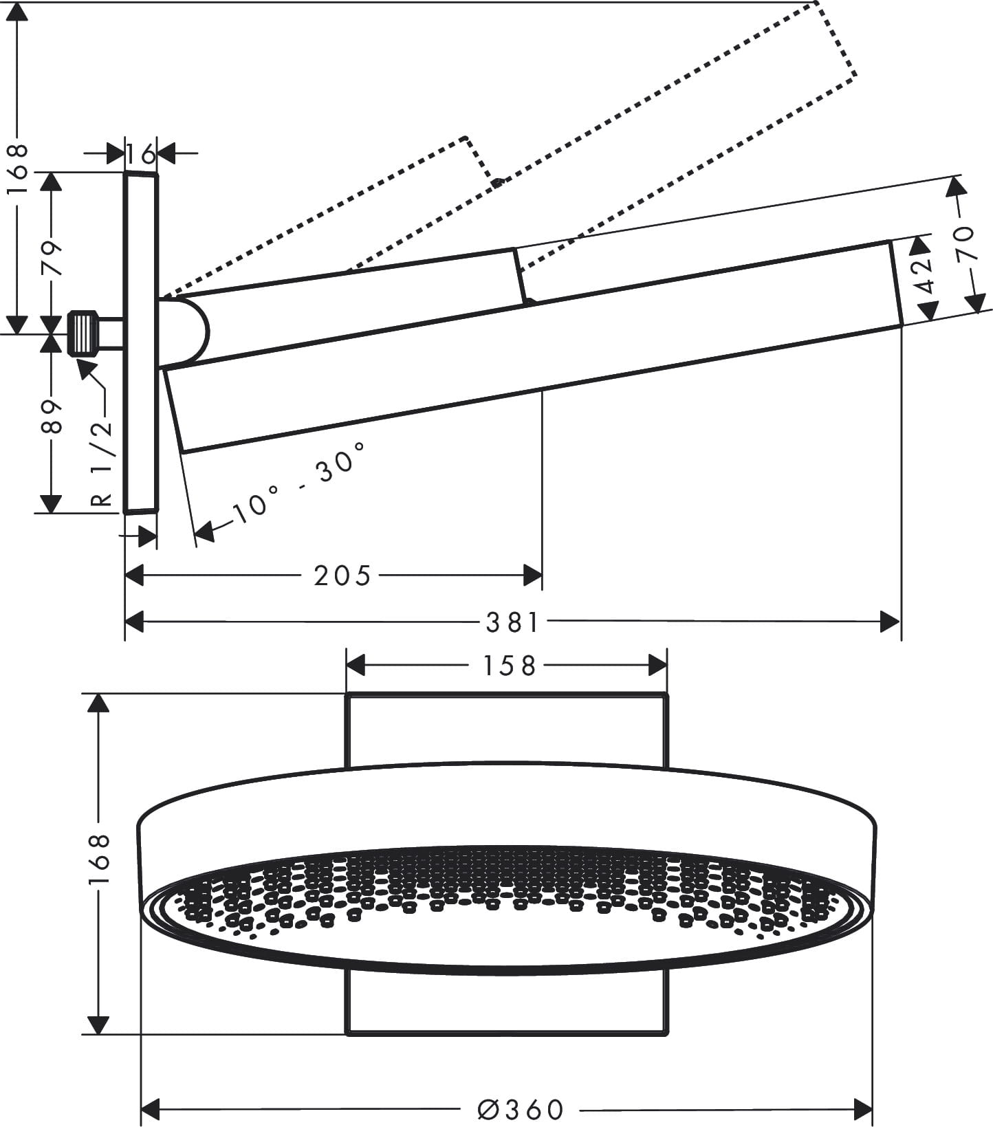 - Głowicę prysznicową można odchylać w pionie w zakresie 10-30 °