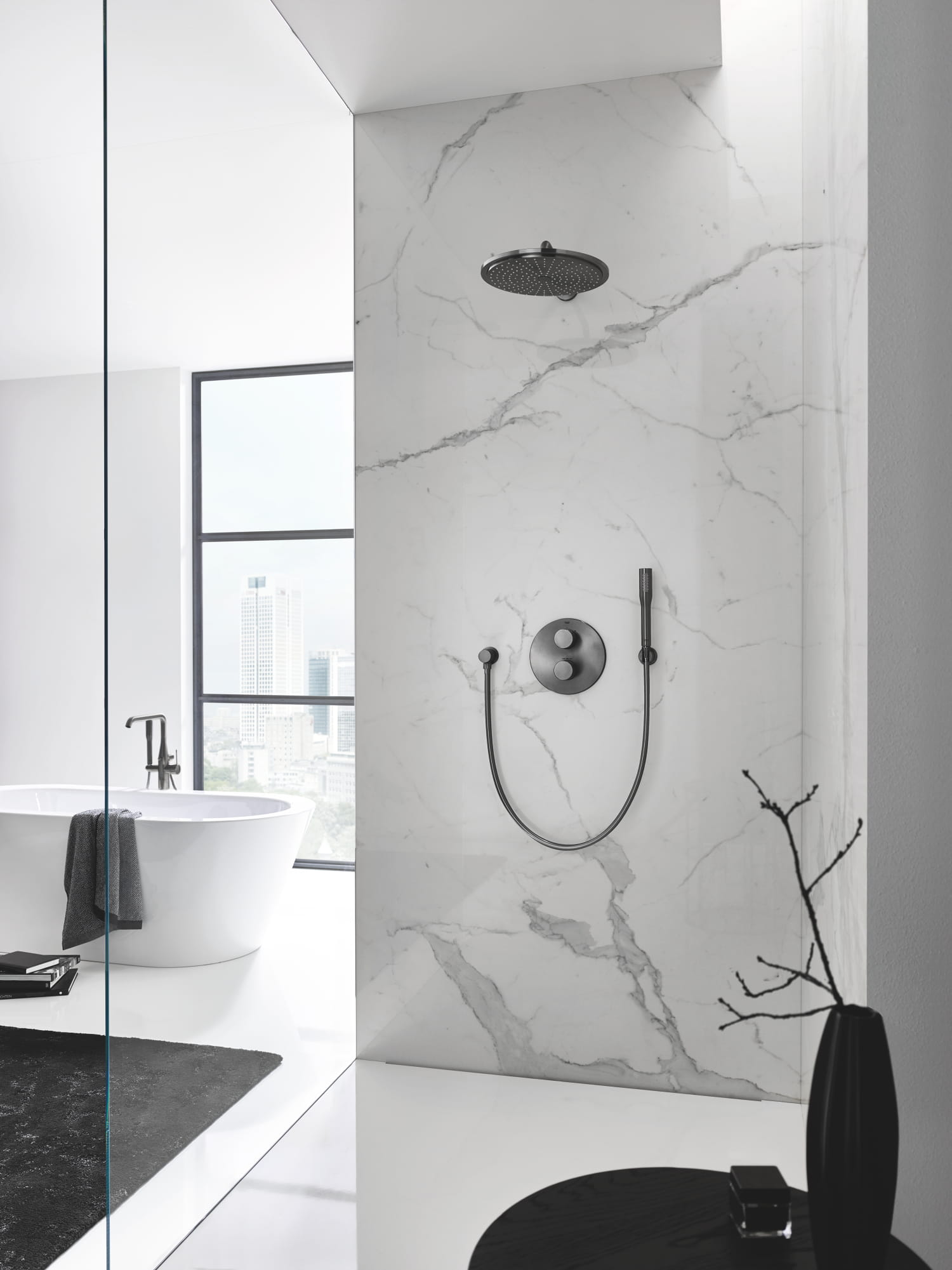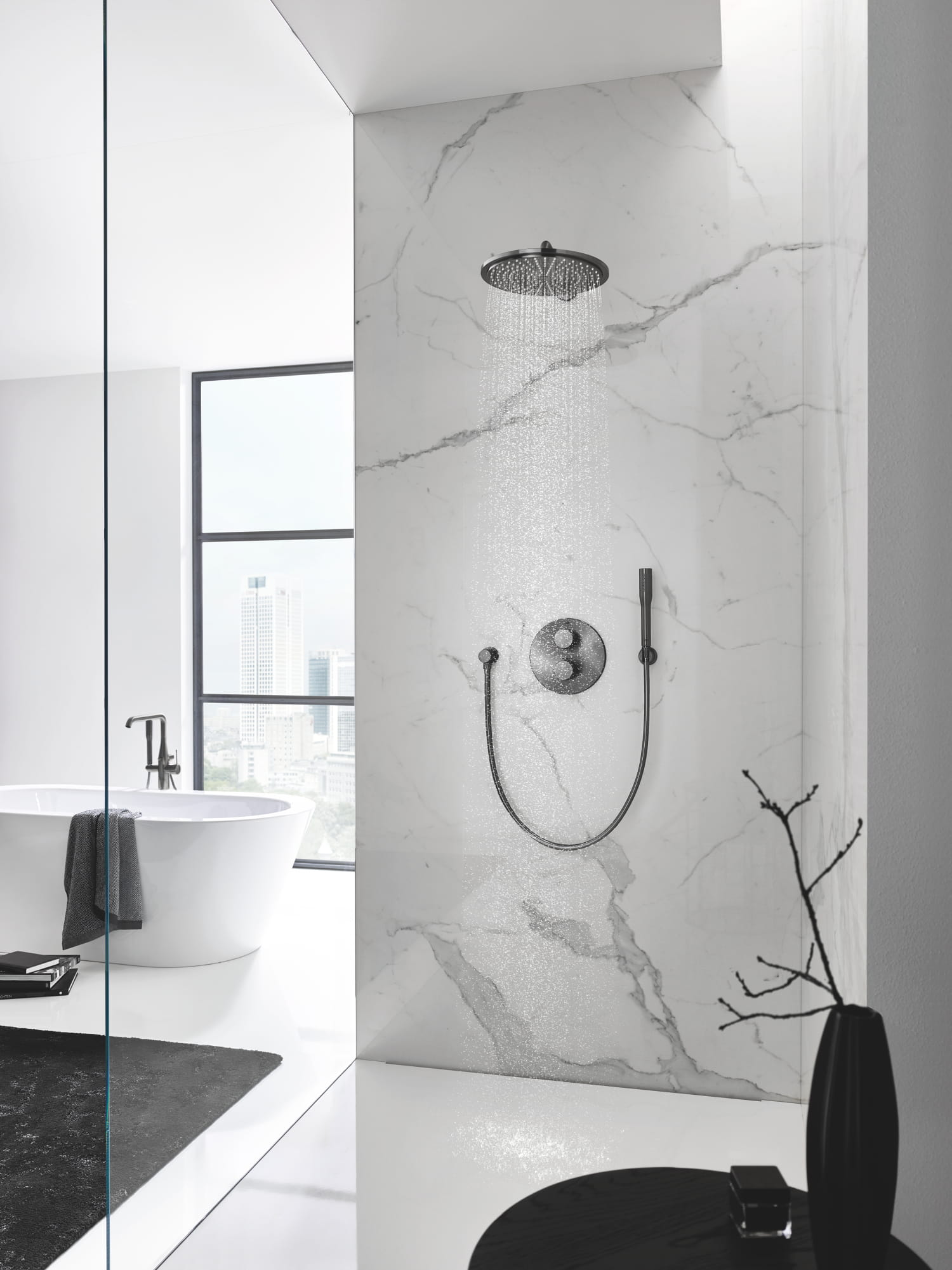 Deszczownica GROHE Rainshower Cosmopolitan 310 z ramieniem prysznicowym to doskonały sposób na luksusową kąpiel w każdej łazience. Jej duża, 310 mm średnica pozwala otulić całe ciało cudownie miękkim strumieniem Rain, który przypomina dotyk letniego deszczu na Twojej skórze. O jego zawsze równy przepływ zadba technologia GROHE DreamSpray, która doprowadza wodę pod równym ciśnieniem do każdej dyszy. Aby zapobiec ich zatkaniu przez osadzający się kamień, wykonano je z silikonu SpeedClean - wystarczy przetarcie ręką, by przywrócić im całkowitą drożność. Aby komfort kąpieli łączył się z oszczędnością, w głowicę natrysku wbudowano ogranicznik przepływu GROHE EcoJoy, który redukuje zużycie wody do zaledwie 9,5 l/min., nie obniżając przy tym wygody użycia i wydajności. Teraz zmniejszysz rachunki i zadbasz o środowisko, ciesząc się jednocześnie pełną funkcjonalnością swojej armatury! Deszczownicę i ramię pokryto matową powłoką w kolorze Brushed HardGraphite, która podkreśla ich ekskluzywny charakter i zachwyca odpornością na uszkodzenia. Przekonaj się o tym już dziś i wybierz deszczownicę GROHE Rainshower Cosmopolitan 310 do swojej łazienki!