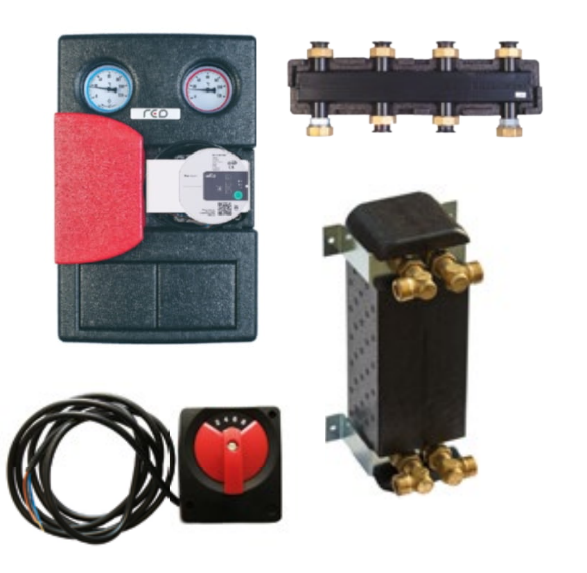 Grupa pompowa RED DN25 pompa WILO, siłownik, rozdzielacz 3 obiegi, wymiennik 24kW R044401004/R044402003/R431501024/R044403001