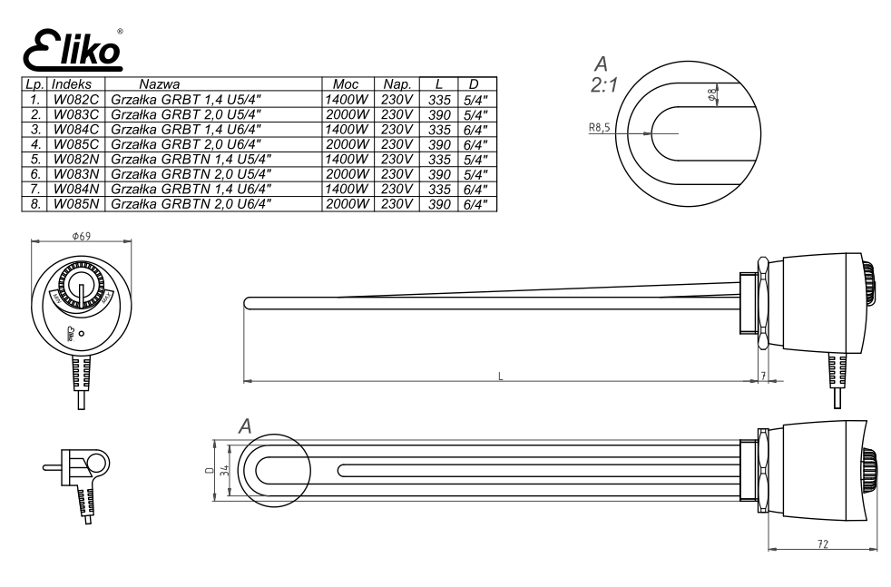 Grzałka elektryczna ELIKO 1400W 230V, do wymienników, mosiądz cynowany W084C