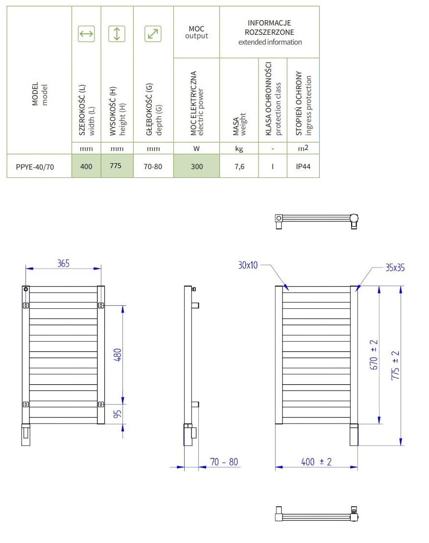 - wysokość z grzałką: 775 mm