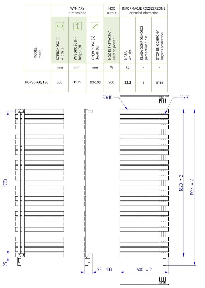 - wysokość z grzałką: 1925 mm