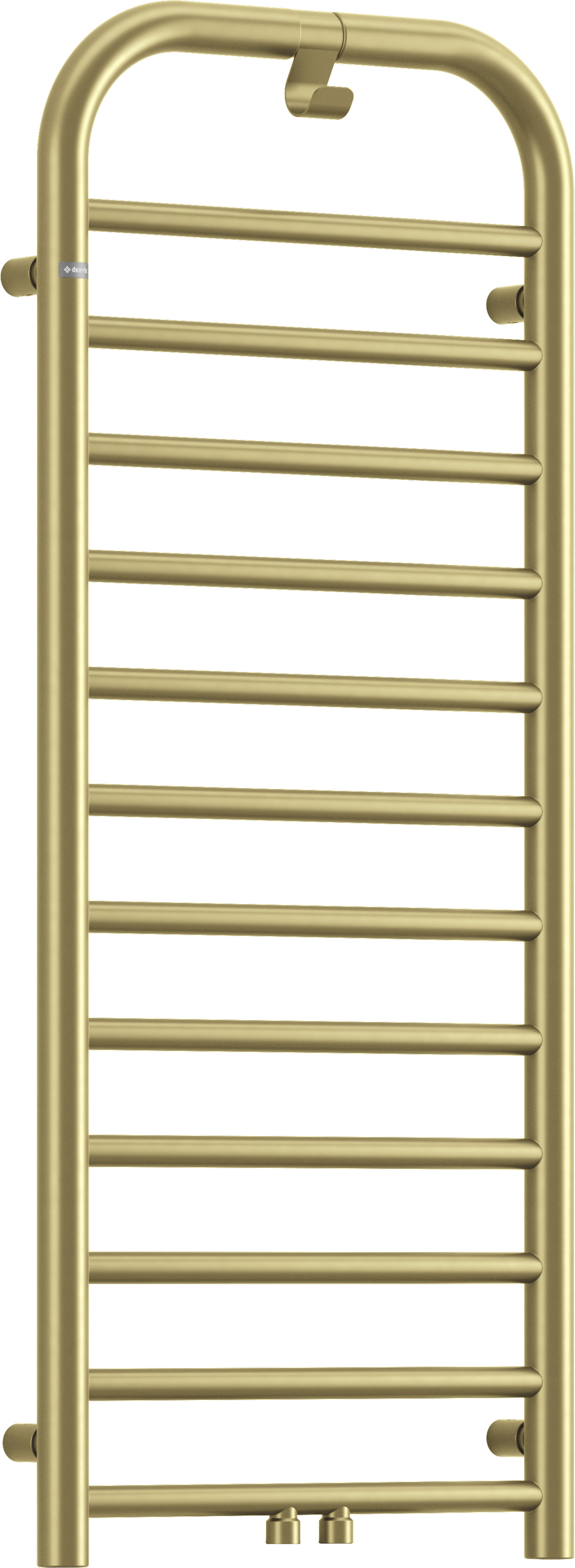 Złoty matowy grzejnik łazienkowy, o wymiarach 1210X500, wyróżnia się obłym kształtem i wyjątkowym wykończeniem. Posiada użyteczny haczyk na ręczniki lub szlafrok, co zwiększa jego praktyczność. Model hybrydowy: wodno-elektryczny z możliwością zamontowania opcjonalnej grzałki 400W, która zapewnia dodatkowe ogrzewanie lub suszenie ręczników poza sezonem grzewczym. Do grzejnika należy dokupić zawór. Zarówno opcjonalna grzałka, jak i niezbędny zawór dostępne są w tym samym kolorze co grzejnik.