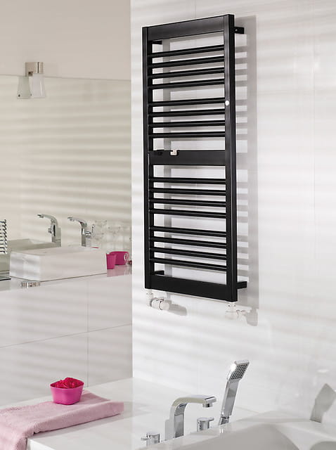 Modne wzornictwo. Kształty grzejnika są uniwersalnie dopasowane do kwadratowej lub owalnej armatury łazienkowej.