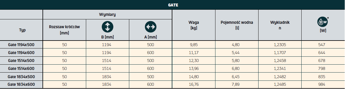 Model Gate przypomina swoim wyglądem bramę ( ang. gate). Dzięki ułożeniu kolektorów stanowi wygodną przestrzeń do suszenia ręczników kąpielowych. Grzejnik z podłączeniem środkowym. Standardowe kolory: czarny matowy RAL 9005, antracytowy matowy RAL 7016 i biały RAL 9016. Inne kolory dostępne na zamówienie.
