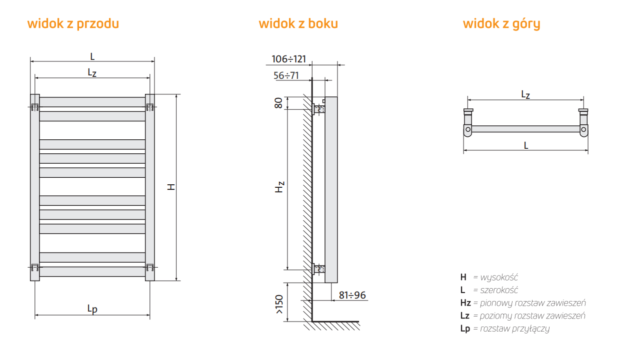 - Wyposażenie podstawowe: zawieszenia o regulowanej odległości od ściany, odpowietrznik 1/8”