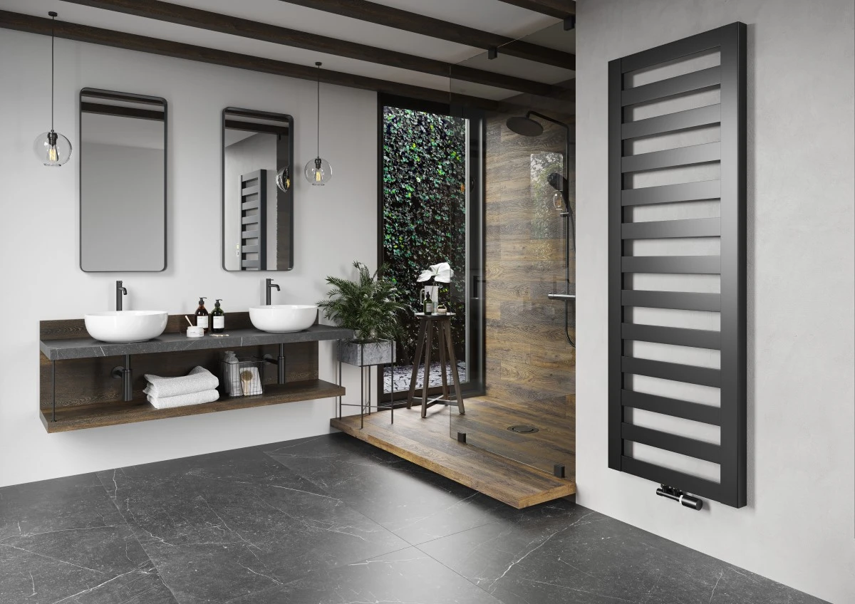 Płaski kształt i konstrukcja grzejnika łazienkowego Rasp nadają mu wyjątkowo elegancki wygląd. Szerokie prostokątne sekcje zapewniają wystarczająco dużo miejsca do suszenia ręczników.
