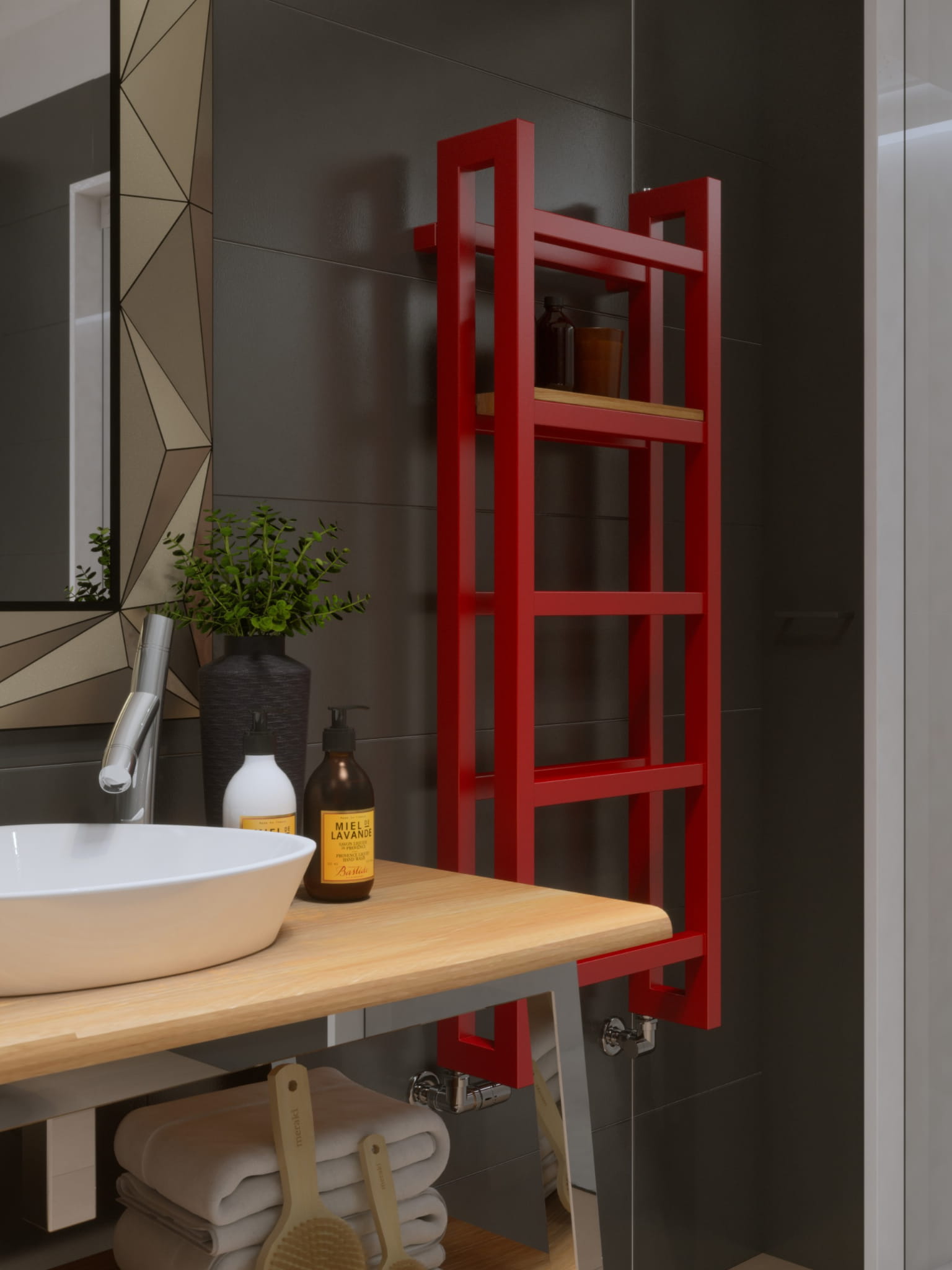 Grzejnik o nowoczesnej skandynawskiej formie. Drewniane półki, które można kompletować z grzejnikiem pozwolą przekształcić go w funkcjonalny łazienkowy lub kuchenny regał. Półki z prawdziwego drewna dostępne są w wersji: dąb, buk oraz tek.