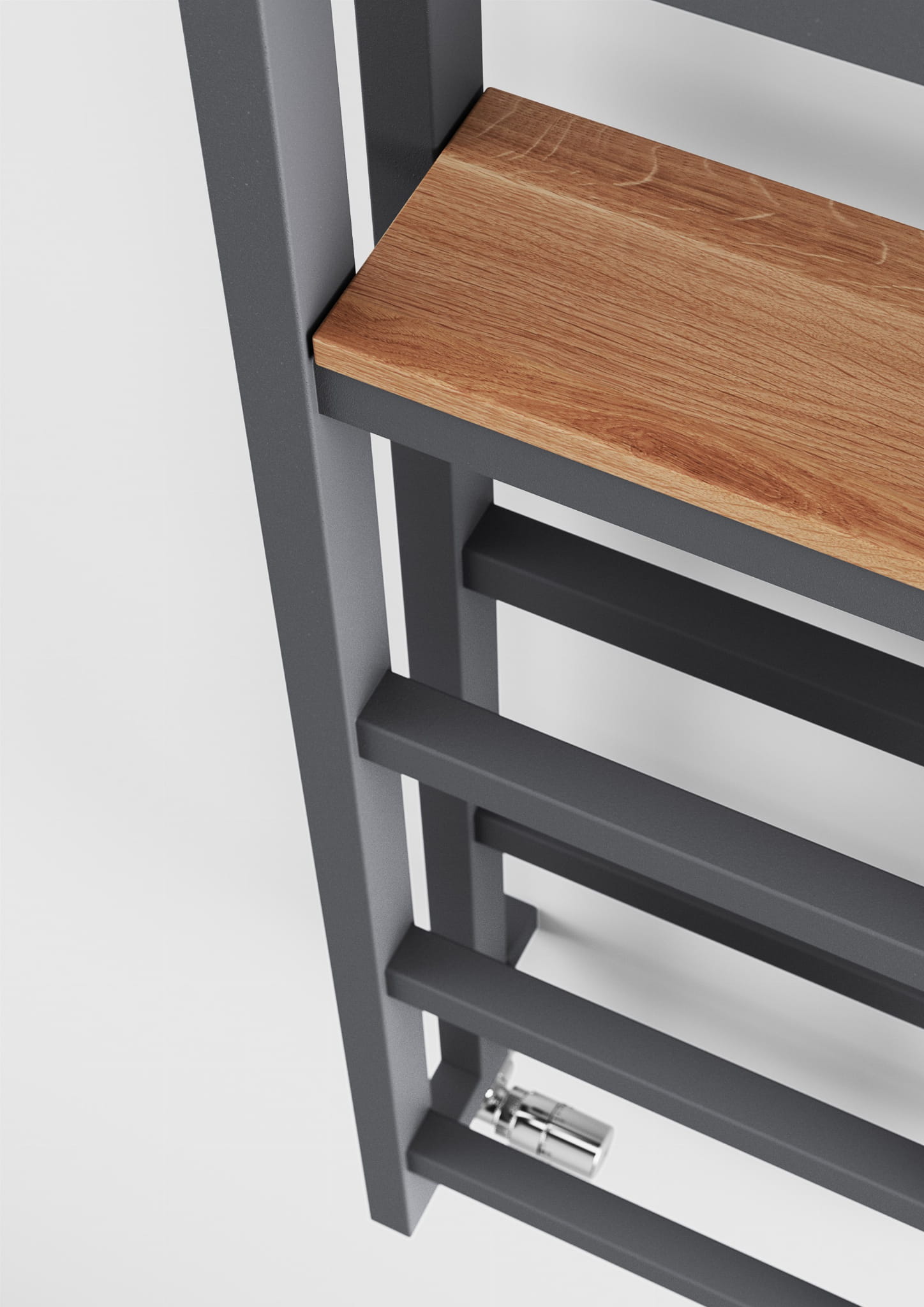 Grzejnik o nowoczesnej skandynawskiej formie. Drewniane półki, które można kompletować z grzejnikiem pozwolą przekształcić go w funkcjonalny łazienkowy lub kuchenny regał. Półki z prawdziwego drewna dostępne są w wersji: dąb, buk oraz tek.
