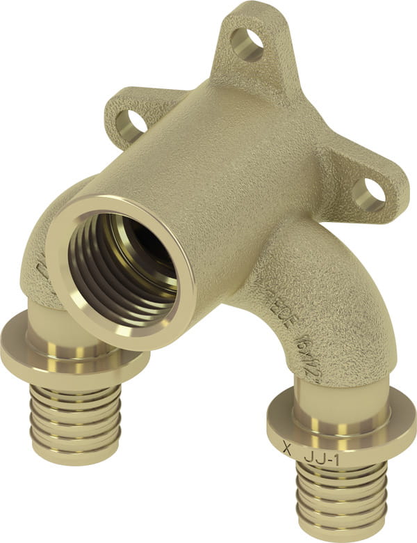 Podwójne kolano naścienne z brązu do łączenia rur TECEflex ze złączkami gwintowanymi lub armaturą z gwintem zgodnie z normą PN-EN 10226, montaż rur TECEflex za pomocą tulei zaciskowych, bez dodatkowych pierścieni uszczelniających typu O-ring. Złączka optymalizująca opór przepływu (wartość dzeta). Odpowiednie do każdej jakości wody pitnej. Bez tulei zaciskowych TECEflex.