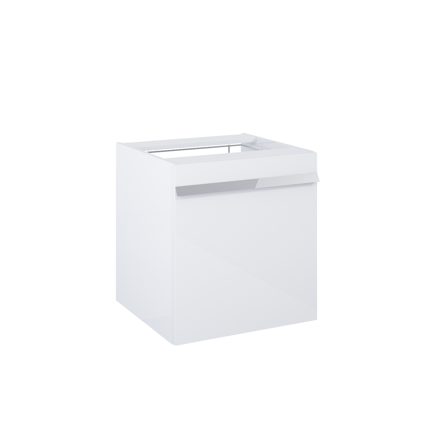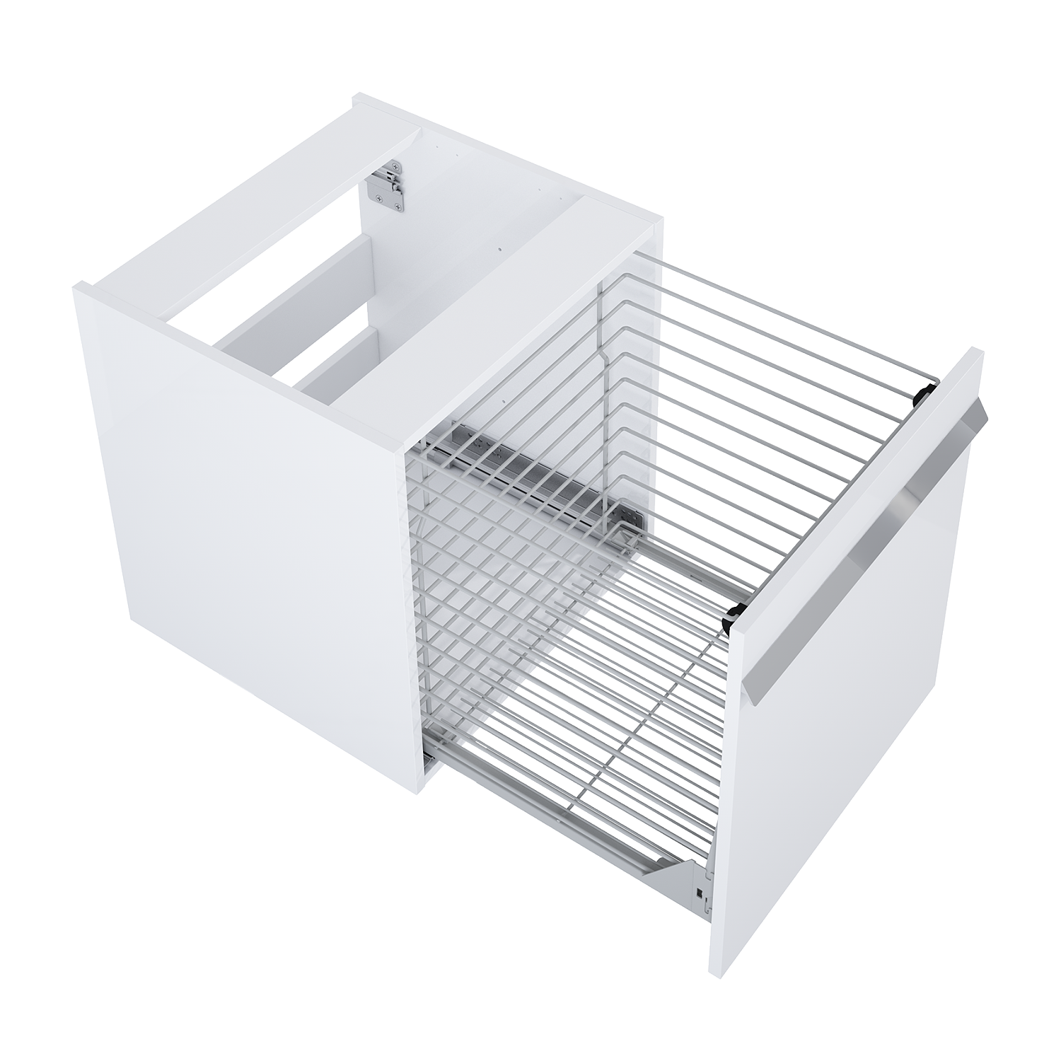 Komoda Moody 50 cm z koszem cargo. Wykonana z materiałów wysokiej jakości, front i korpus z płyty laminowanej, lakierowanej na wysoki połysk w kolorze white. Uchwyty metalowe w kolorze chrom połysk. Kosz cargo w komodzie posiada wytrzymałe prowadnice o udźwigu do 20 kg, z pełnym wusuwem i systemem soft-close. Istnieje możliwość dokupienie trapezowych metalowych nóg w kolorze chrom.