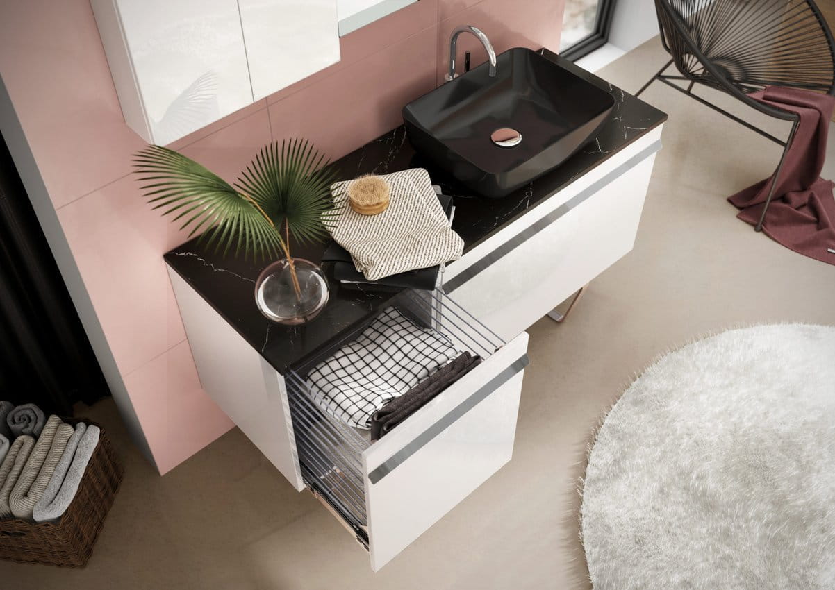 Proste linie, elegancja i wyrafinowany styl. Kolekcja Mebli łazienkowych Moody zaskoczy cię oryginalnością. Kolekcja ta, uwagę przykuwa nie tylko swym nietuzinkowym kształtem, ale także kolorem. Stylowa biel połyskliwych frontów urzeka swoją subtelnością, a wyrazistość matowej czerni -nadaje nowoczesności.