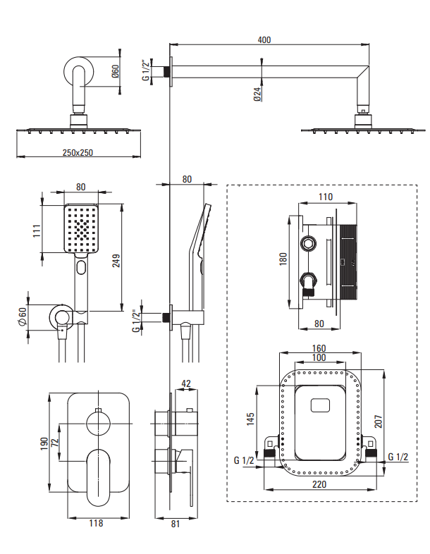 Zestaw prysznicowy składa się z BOXa, deszczowni i słuchawki wraz z uchwytem i wężem. Montaż podtynkowy charakteryzuje się nowoczesnym designem i wyjątkową estetyką. Zarówno słuchawka, jak i deszczownia posiadają system anti-calc, dzięki czemu są łatwe do utrzymania w czystości. Kupując zestaw, masz pewność, że wszystkie elementy będą idealnie do siebie pasowały.