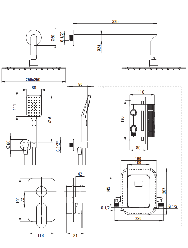 Zestaw prysznicowy składa się z BOXa, deszczowni i słuchawki wraz z uchwytem i wężem. Montaż podtynkowy charakteryzuje się nowoczesnym designem i wyjątkową estetyką. Box mieszaczowy wyróżnia się precyzją wykonania, wyposażony został w 3-funkcyjny przełącznik natrysku. Deszczownia w ciekawym, kwadratowym kształcie wykonana jest z wysokogatunkowej stali nierdzewnej. Słuchawka natryskowa posiada 3 funkcje: deszczowy, mieszany i mgiełka wodna. Zarówno deszczownia, jak i słuchawka wyposażone zostały w system anti-calc, dzięki czemu są łatwe do utrzymania w czystości. Ruchome przyłącze kątowe do słuchawki pozwala na precyzyjne jej ustawienie, a wąż z systemem anti-twist zapobiega jego skręcaniu. Całość wykończona jest w eleganckiej matowej czerni. Jest to jeden z najczęściej wykorzystywanych kolorów do dekoracji mieszkania. Barwa ta doskonale sprawdza się także w łazienkach i znakomicie współgra z nowoczesnym, minimalistycznym designem.