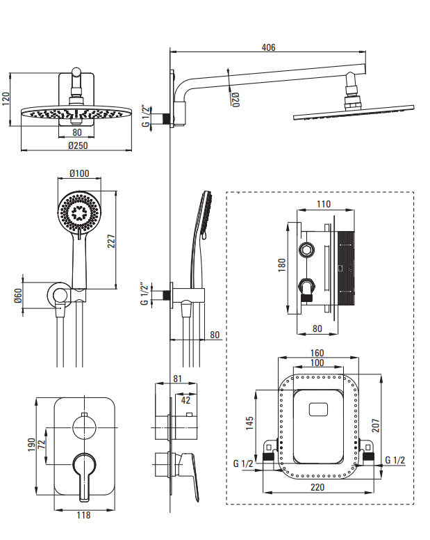- deszczownica stalowa o średnicy 25 cm z ramieniem i z systemem anti-calc