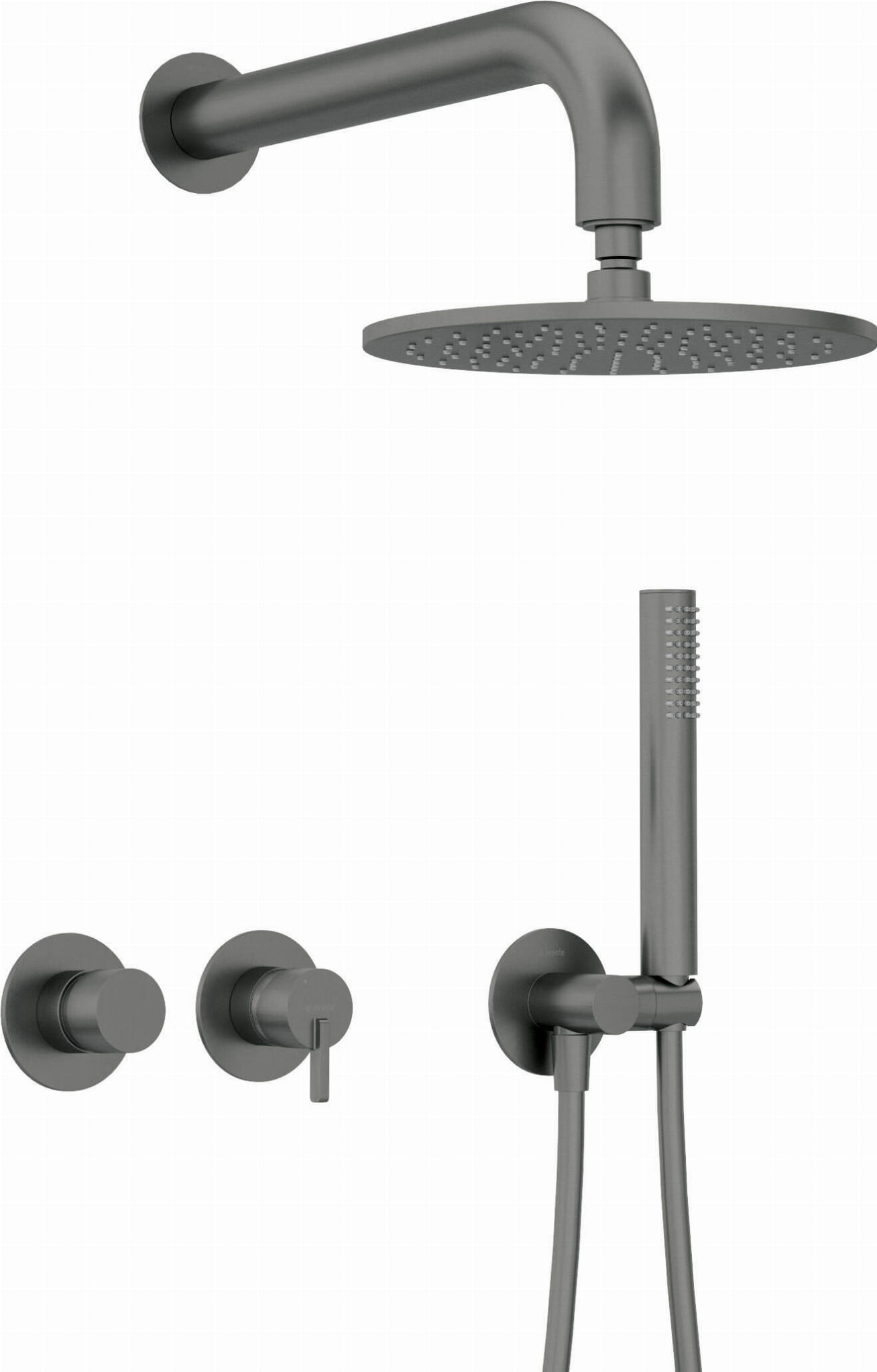 Set prysznicowy Silia w wykończeniu Titanium to idealna propozycja dla miłośników nowoczesnego, industrialnego designu. Zestaw składa się z wylewki ściennej, głowicy natryskowej, mosiężnej baterii z ceramicznym przełącznikiem funkcji, węża prysznicowego oraz słuchawki i ruchomego przyłącza kątowego.