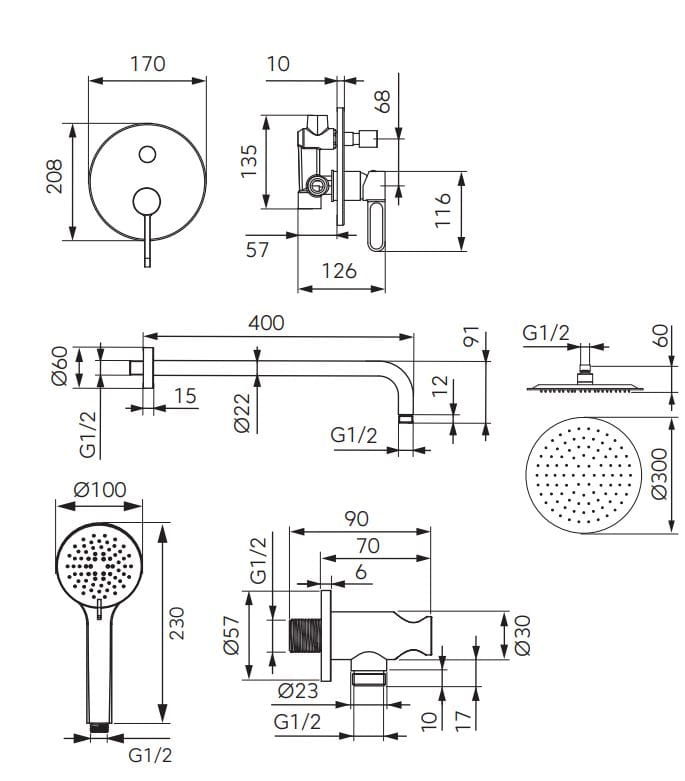 - bateria podtynkowa 2-funkcyjna z przełącznikiem deszczownica/rączka natrysku