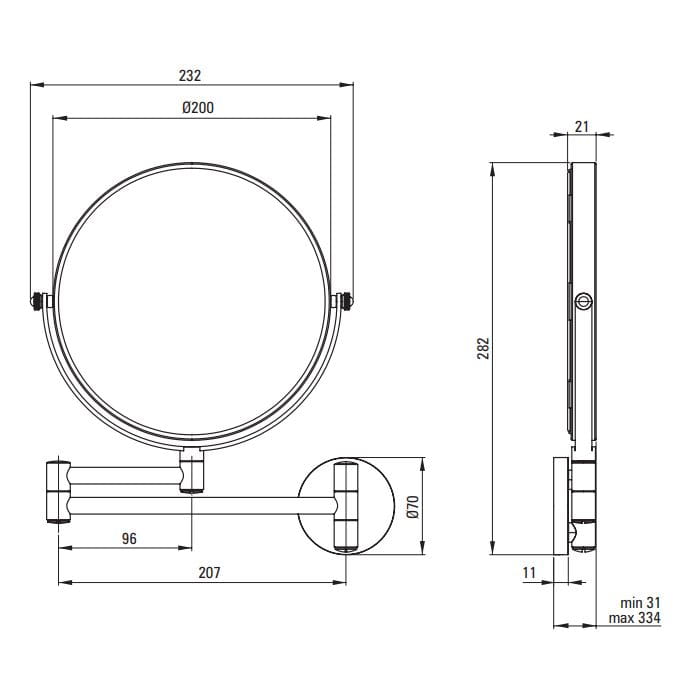 Lusterko kosmetyczne pochodzi z serii Round i przeznaczone jest do montażu ściennego. Długie, ruchome ramię pozwala na dowolne ustawienie lusterka. Lustro jest dwustronne, przy czym jedna ze stron powiększa odbicie aż 3-krotnie. Zwierciadło wykończone jest w błyszczącym, eleganckim chromie i idealnie pasuje do innych dodatków z serii Round.