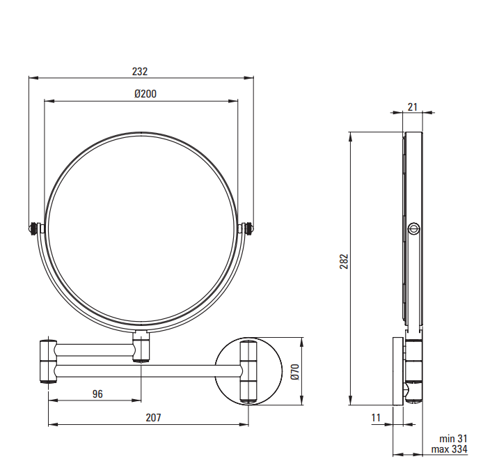Lusterko kosmetyczne pochodzi z serii Round i przeznaczone jest do montażu ściennego. Posiada długie, regulowane ramię umożliwiające elastyczne dostosowanie pozycji. Dzięki temu, że jest dwustronne oferuje standardowe oraz 3-krotne powiększenie. Szczotkowane złote wykończenie lustra doskonale komponuje się z resztą akcesoriów Round w tej samej barwie.