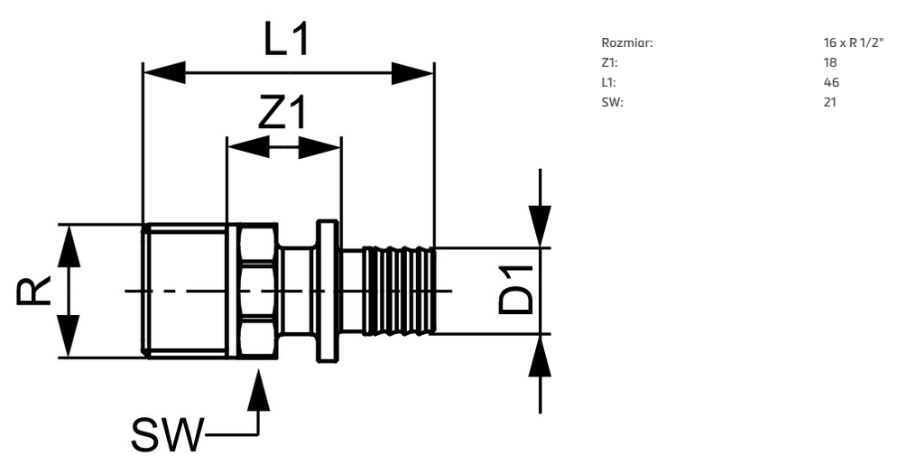 Nypel przejściowy TECE Flex 16x1/2" GZ z mosiądzu standard 765502