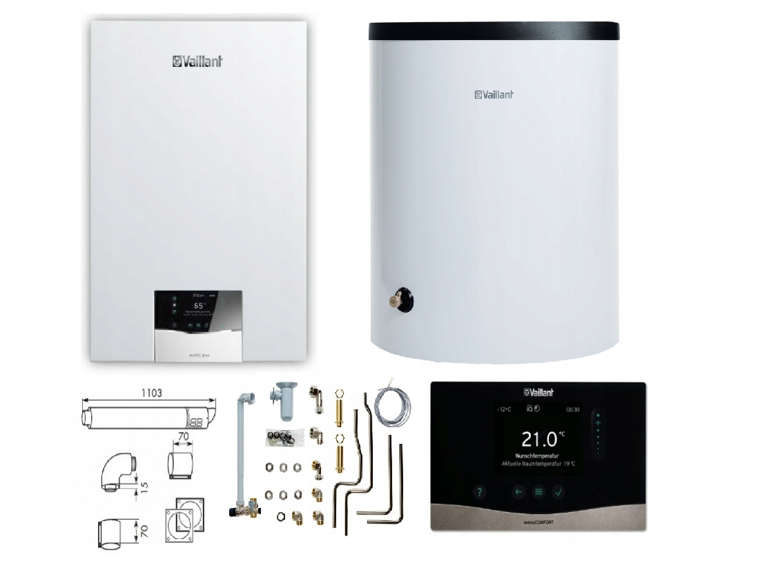 Pakiet: Kocioł kondensacyjny VAILLANT VC 20CS/1-5 20kW + zasobnik VIH R 120/6 B + zestaw podłączeniowy VIH + sterownik sensoCOMFORT 720 + zestaw do szachtu 0010043619