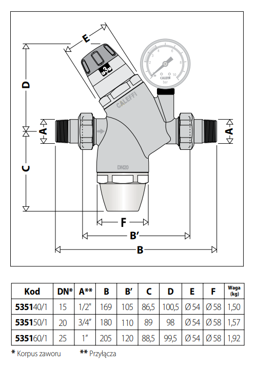 Regulator ciśnienia CALEFFI 1", 0-10 bar, z manometrem 535161
