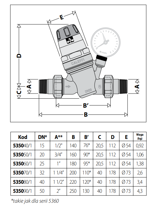 Regulator ciśnienia CALEFFI 1/2", 1-6 bar, z manometrem 535041