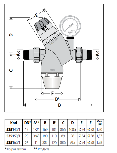 Regulator ciśnienia CALEFFI 3/4", 1-6bar, z filtrem i manometrem 535151
