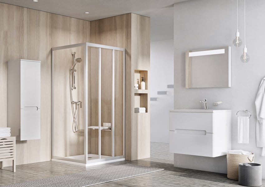 Łącząc drzwi prysznicowe ze ścianką stałą uzyskasz przestrzeń prysznicowa aż do rozmiaru 120 x 90 cm. Dzięki wykorzystaniu ścianki stałej w łazience zmieści się też pralka.