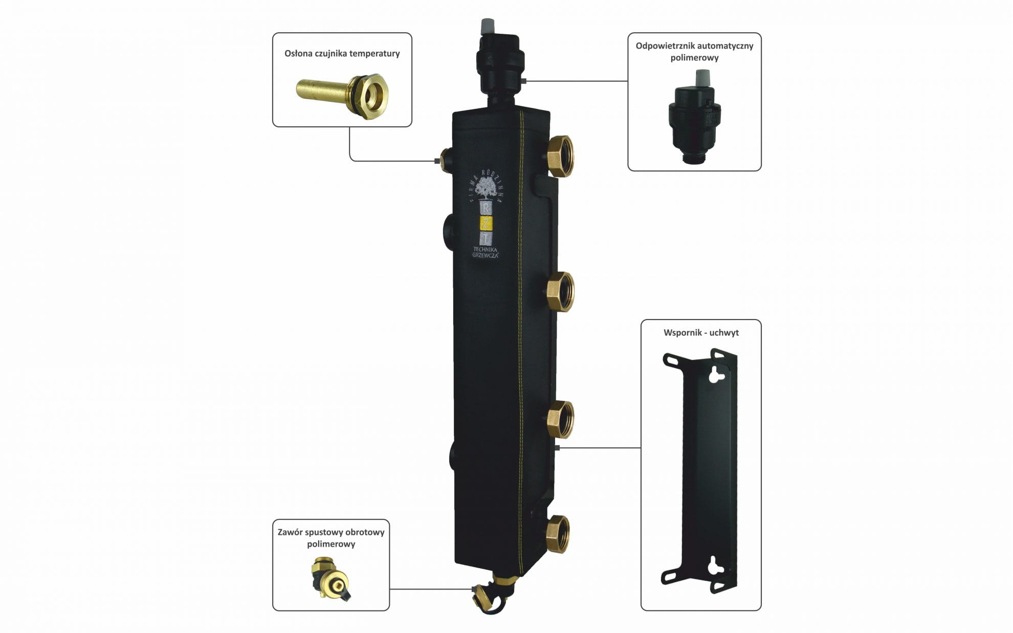 Sprzęgło hydrauliczne dwufunkcyjne z ukierunkowanym przepływem to produkt służący do jednoczesnego zrównoważenia i rozdzielania czynnika grzewczego. Sprzęgło posiada wewnętrzną sekcję, która rozbija pęd wody, ocieplone jest pianką kauczukową i zabezpieczone pokrowcem. Posiada odpowietrznik automatyczny, osłonę czujnika temperatury, zawór spustowy obrotowy oraz wspornik.