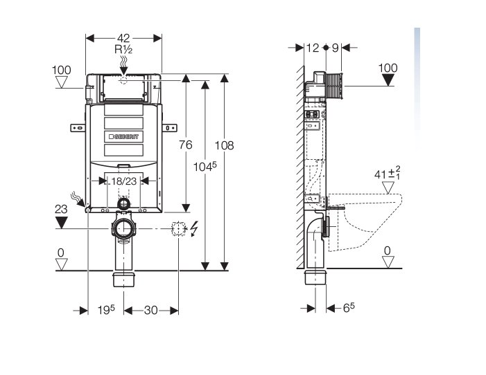 Rama elementu montażowego powlekana proszkowo. Rama montażowa z czterema kątownikami montażowymi. Kolano przyłączeniowe z możliwością montażu bez użycia narzędzi. Spłuczka podtynkowa uruchamiana z przodu. Spłuczka podtynkowa z izolacją przeciwroszeniową. W przypadku ustawień fabrycznych ponowne spłukiwanie możliwe natychmiast. Prace montażowe i serwisowe przy spłuczce podtynkowej bez użycia narzędzi. Przyłącze wody z tyłu lub na górze na środku. Obudowa ochronna otworu rewizyjnego chroni przed wilgocią i zabrudzeniami. Obudowa ochronna otworu rewizyjnego z możliwością skrócenia. Wyposażono w rurkę ochronną umożliwiającą szybkie podłączenie wody do toalet myjących Geberit AquaClean. Z możliwością zamocowania przyłącza elektrycznego