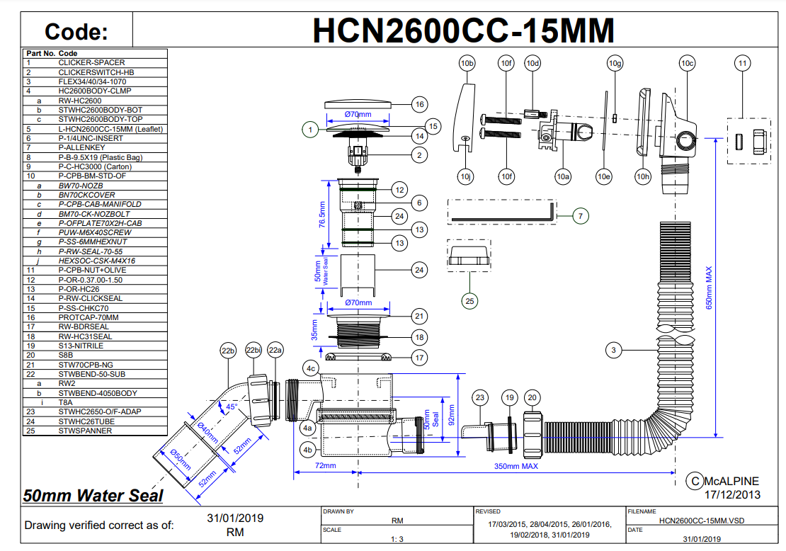 Syfon wannowy MCALPINE z mechanizmem napełniającym, korek klik-klak biały HCN2600CC-15MM-WH