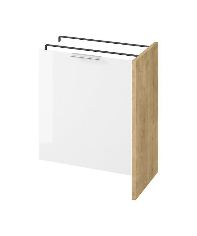 Szafka do zabudowy pralki z drzwiami idealnie wkomponuje sprzęt AGD w ogólny wystrój wnętrza, estetycznie chowając go za drzwiami mebla. Szafka została wykonana z płyty wiórowej, z bokiem w kolorze naturalnego dębu, oraz frontem w kolorze białym. Istnieje możliwość dokupienia uchwytów w kolorze czarnym lub srebrnym.