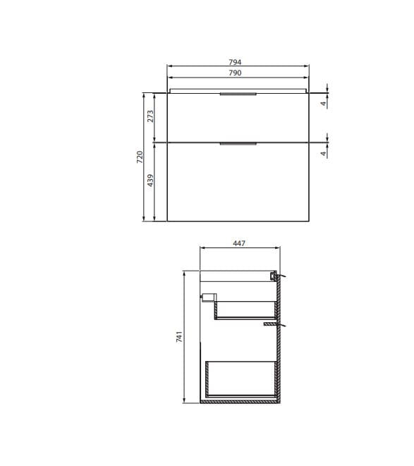Szafka podumywalkowa wykonana z płyty wiórowej, wyposażona została w dwie pojemne szuflady z systemem cichego domyku. Do szafki dopasujemy wygodne uchwyty w kolorze czarnym lub srebrnym matowym (do kupienia osobno). Istnieje również możliwość dokupienia nóżek meblowych w tych samych kolorach, które spełnią funkcję dekoracyjną.