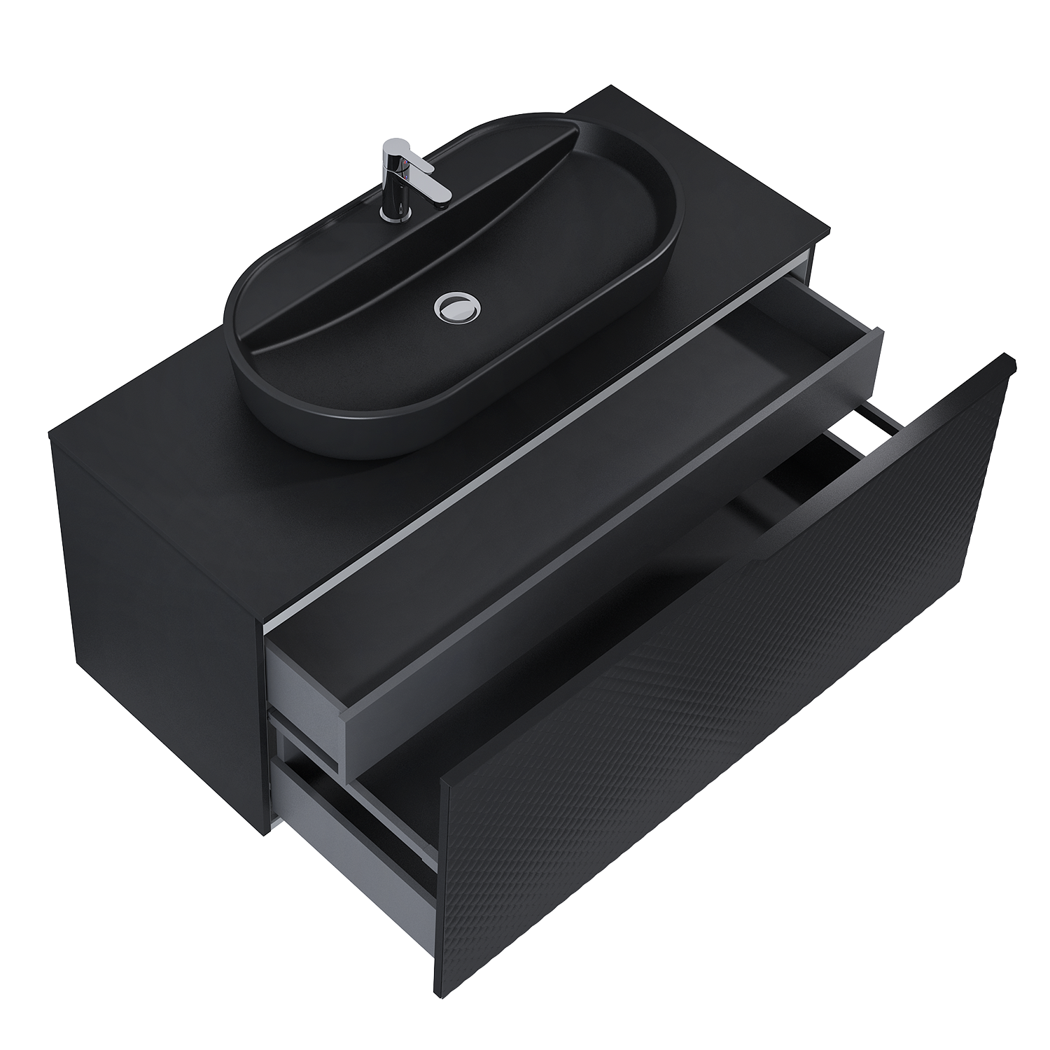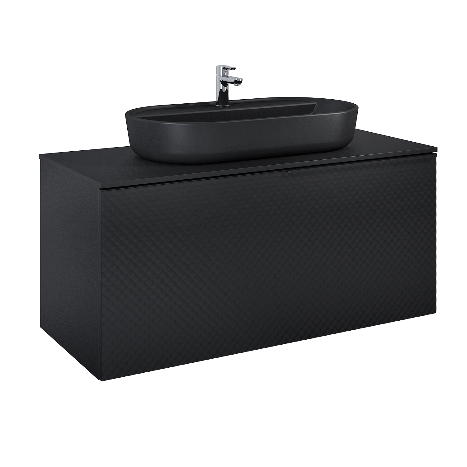 Szafka podumywalkowa Glam 120 cm w kolorze black matt. Szafka posiada 2 szuflady, jedna głęboka z relingami zabezpieczającymi i druga nieco płytszą, umieszczona tuż pod blatem. Szafka wykonana jest z materiałów wysokiej jakości, front i korpus z płyty laminowanej. Front szafki dodatkowo uszlachetniony szkłem ornamentowym. Uchwyt metalowy w kolorze black matt. Do prawidłowego funkcjonowania szafki konieczne jest zastosowanie syfonu oszczędzającego miejsce.