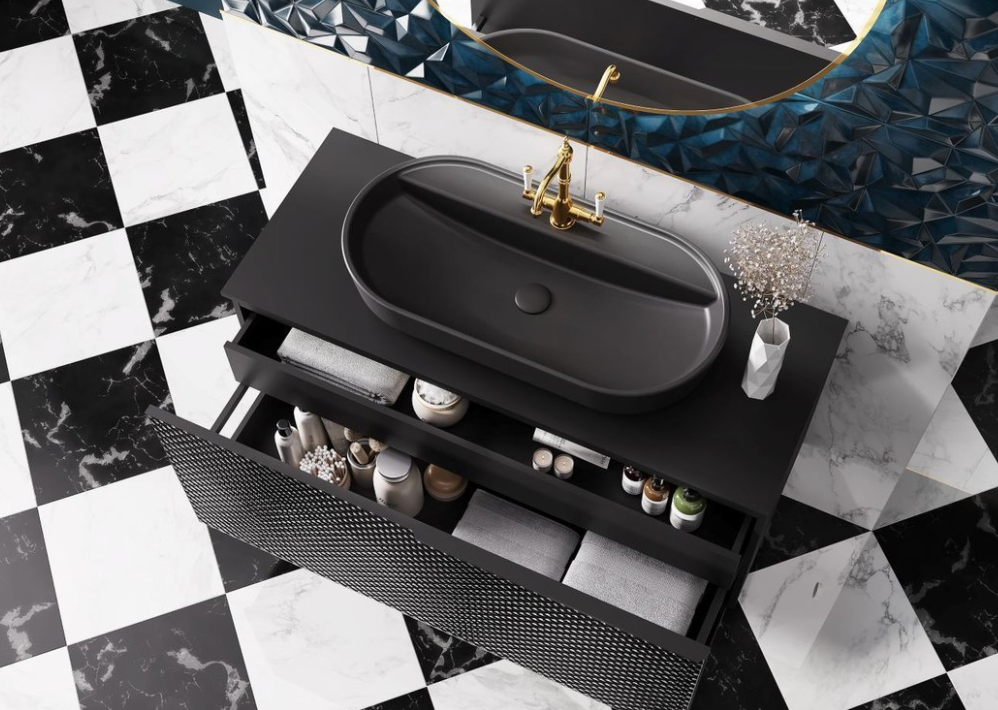 Z pozoru masywna seria mebli pozwoli zmienić łazienkową rutynę w wyjątkowe doświadczenie. Efektowny front kryje za sobą dwie asymetryczne szuflady z metalowymi bokami w antracytowym wykończeniu. Bogata gama możliwości wyposażenia nie pozostawia wątpliwości, że mamy do czynienia z funkcjonalnym meblem najwyższej klasy. Kolekcja mebli łazienkowych Glam to unikatowe połączenie imponującej szafki z blatami ElitStone i umywalkami nablatowymi.