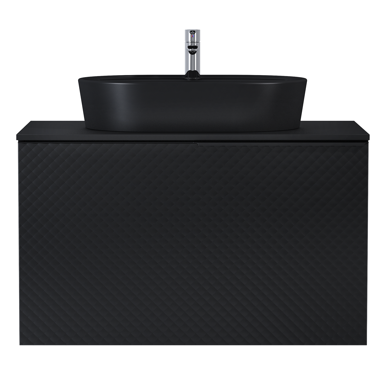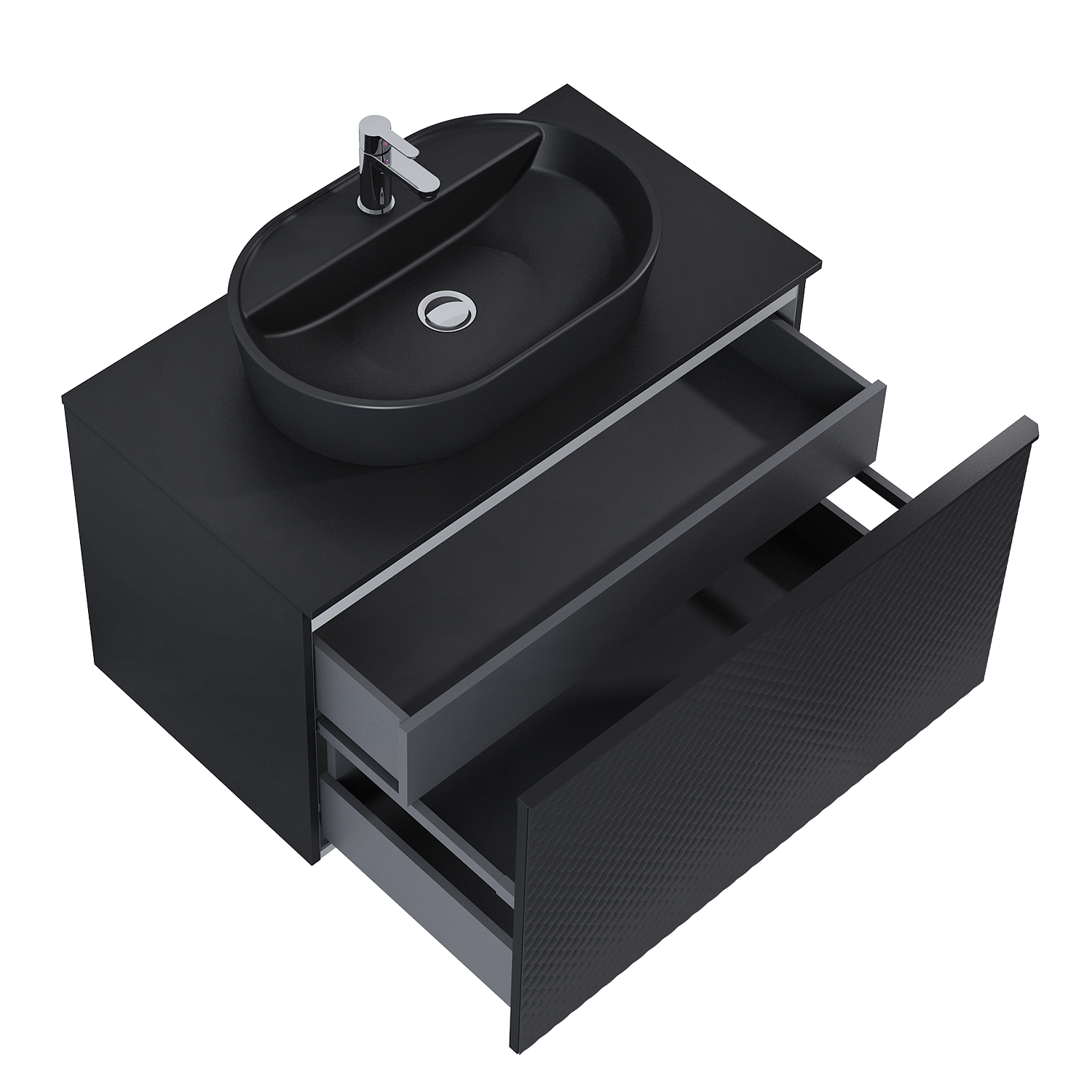 Szafka podumywalkowa Glam 90 cm w kolorze black matt. Szafka posiada 2 szuflady, jedna głęboka z relingami zabezpieczającymi i druga nieco płytszą, umieszczona tuż pod blatem. Szafka wykonana jest z materiałów wysokiej jakości, front i korpus z płyty laminowanej. Front szafki dodatkowo uszlachetniony szkłem ornamentowym. Uchwyt metalowy w kolorze black matt. Do prawidłowego funkcjonowania szafki konieczne jest zastosowanie syfonu oszczędzającego miejsce.