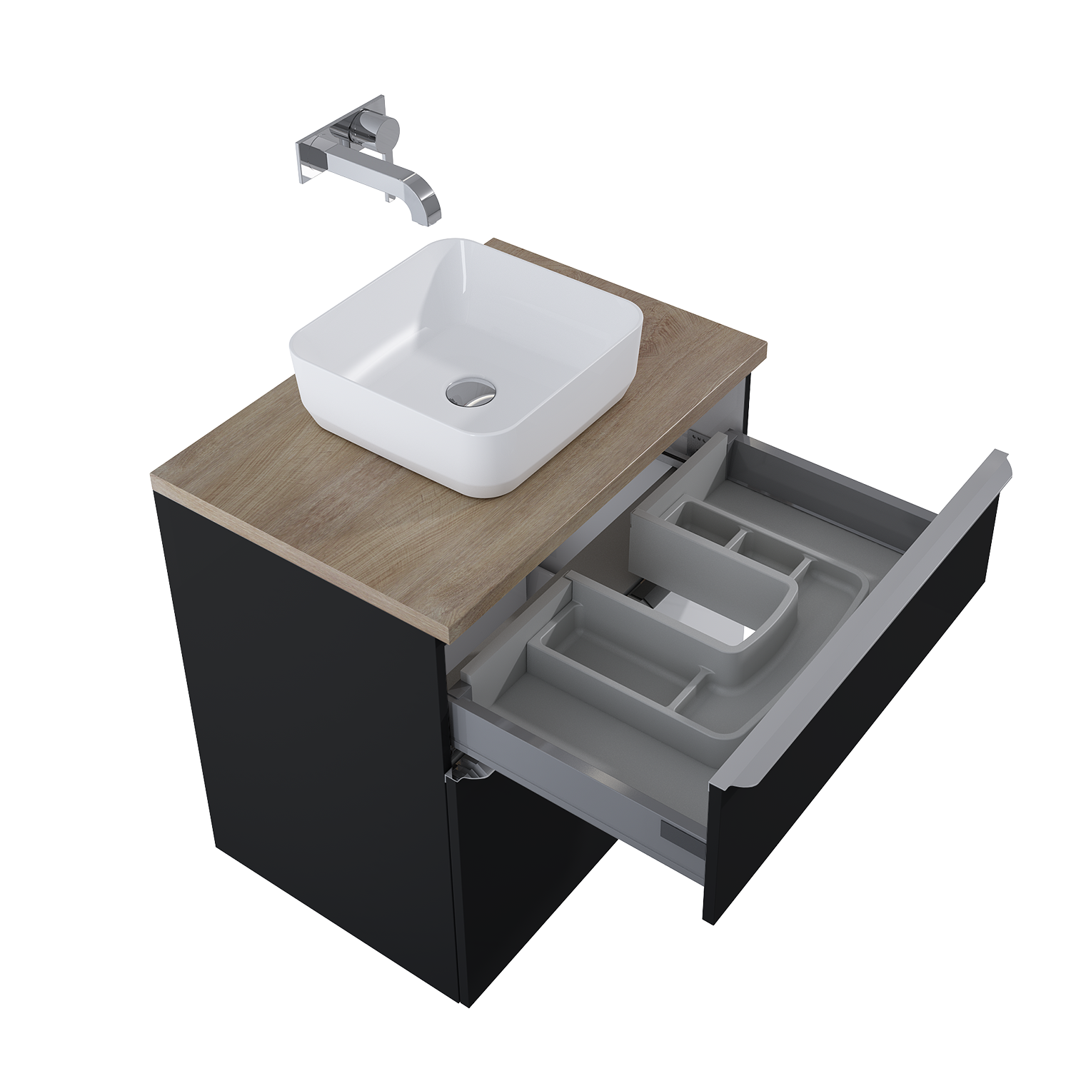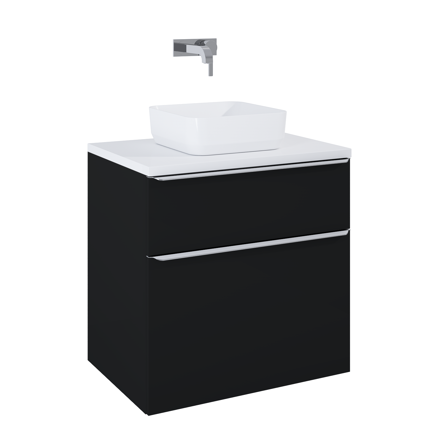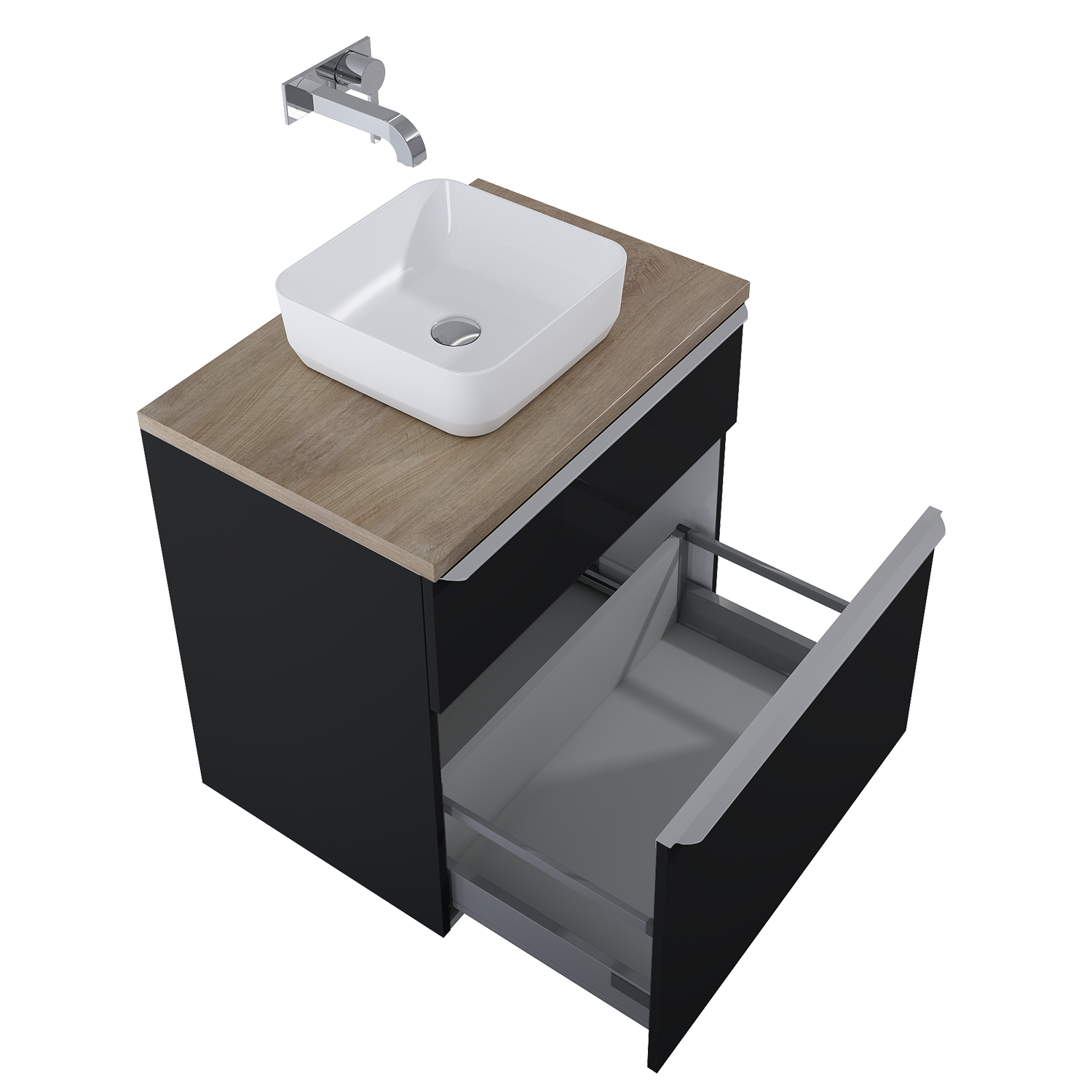 Szafka podumywalkowa Lofty 70 cm, 2 szuflady z funkcją cichego samodomyku oraz z pełnym wysuwem. Pierwsza szuflada zaopatrzona w organizer. Szafka wykonana z materiałów wysokiej jakości, front i korpus z płyty laminowanej, lakierowanej w kolorze black matt. Standardowo szafka zaopatrzona w metalowe uchwyty w kolorze chrom połysk. Uchwyty dostępne również w kolorze gold połysk i black mat, sprzedawane po 1 sztuce.