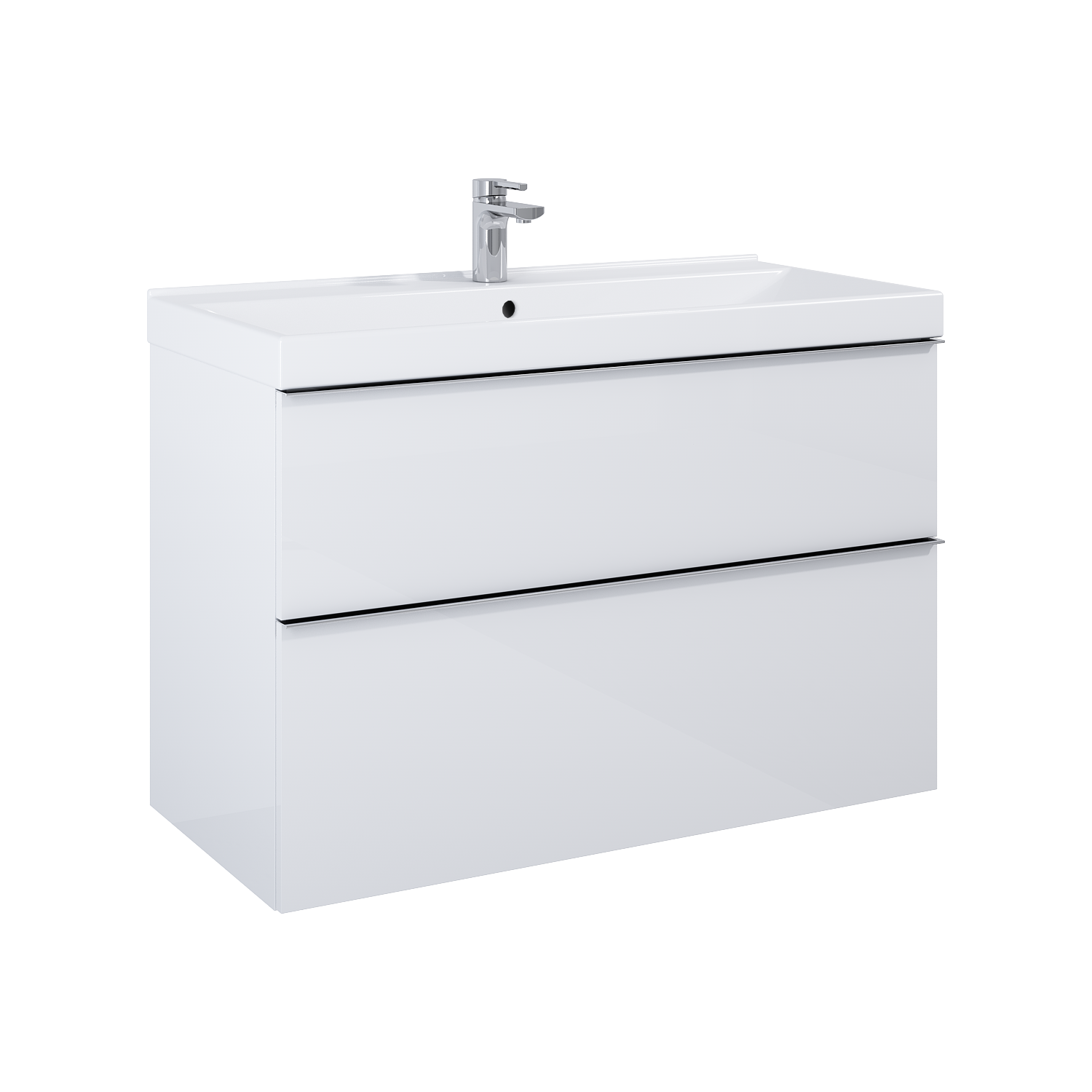 Szafka podumywalkowa Look 100 cm biała, bez blatu, 2 szuflady z funkcją cichego samodomyku oraz z pełnym wysuwem, zaopatrzona w organizer. Szafka wykonana z materiałów odpornych na działanie wilgoci, front i korpus lakierowany, uchwyty metalowe w kolorze chrom połysk. Szafka przygotowana do łączenia z umywalką lub blatem.