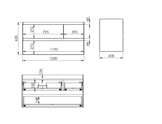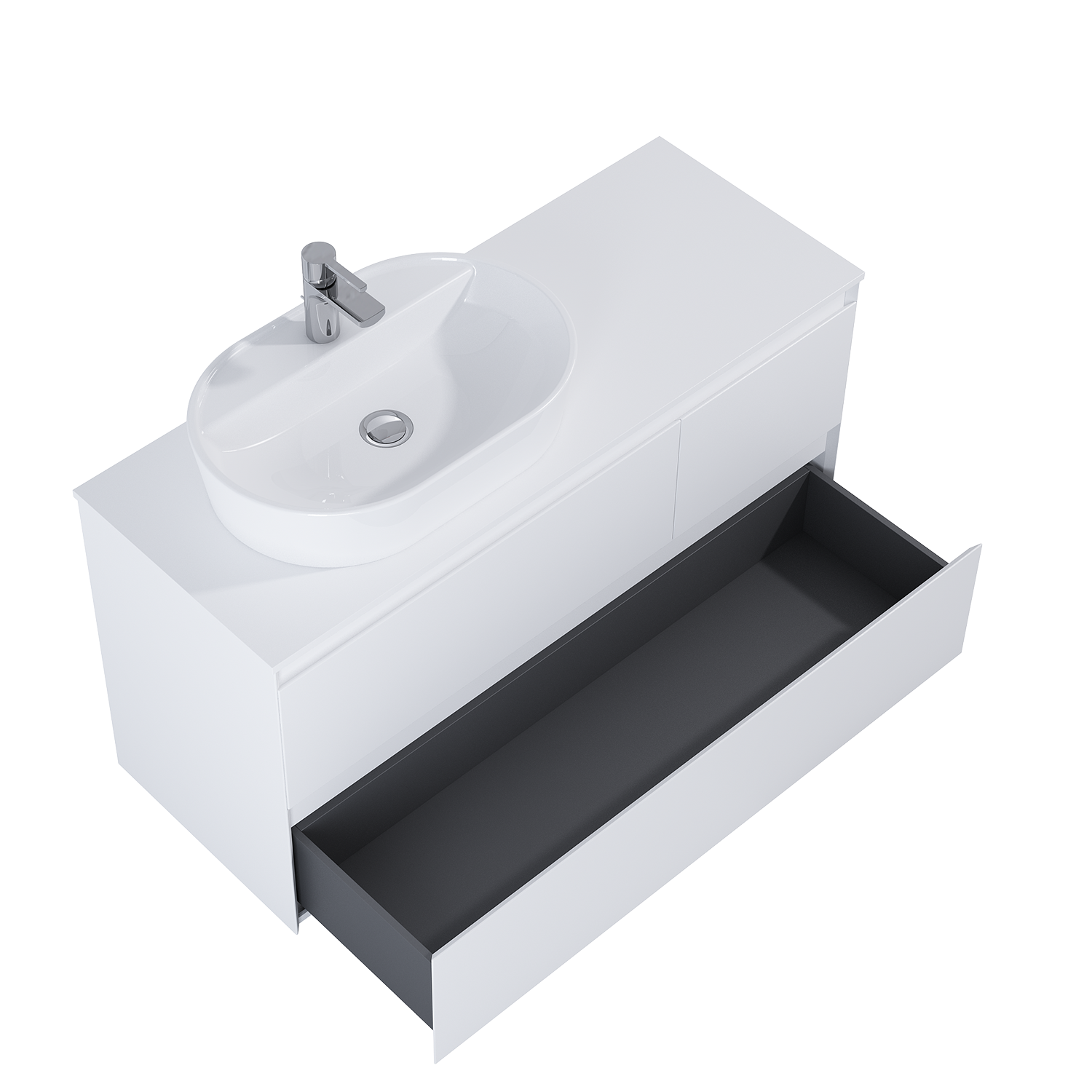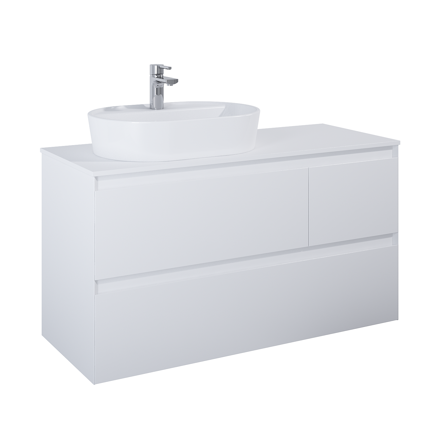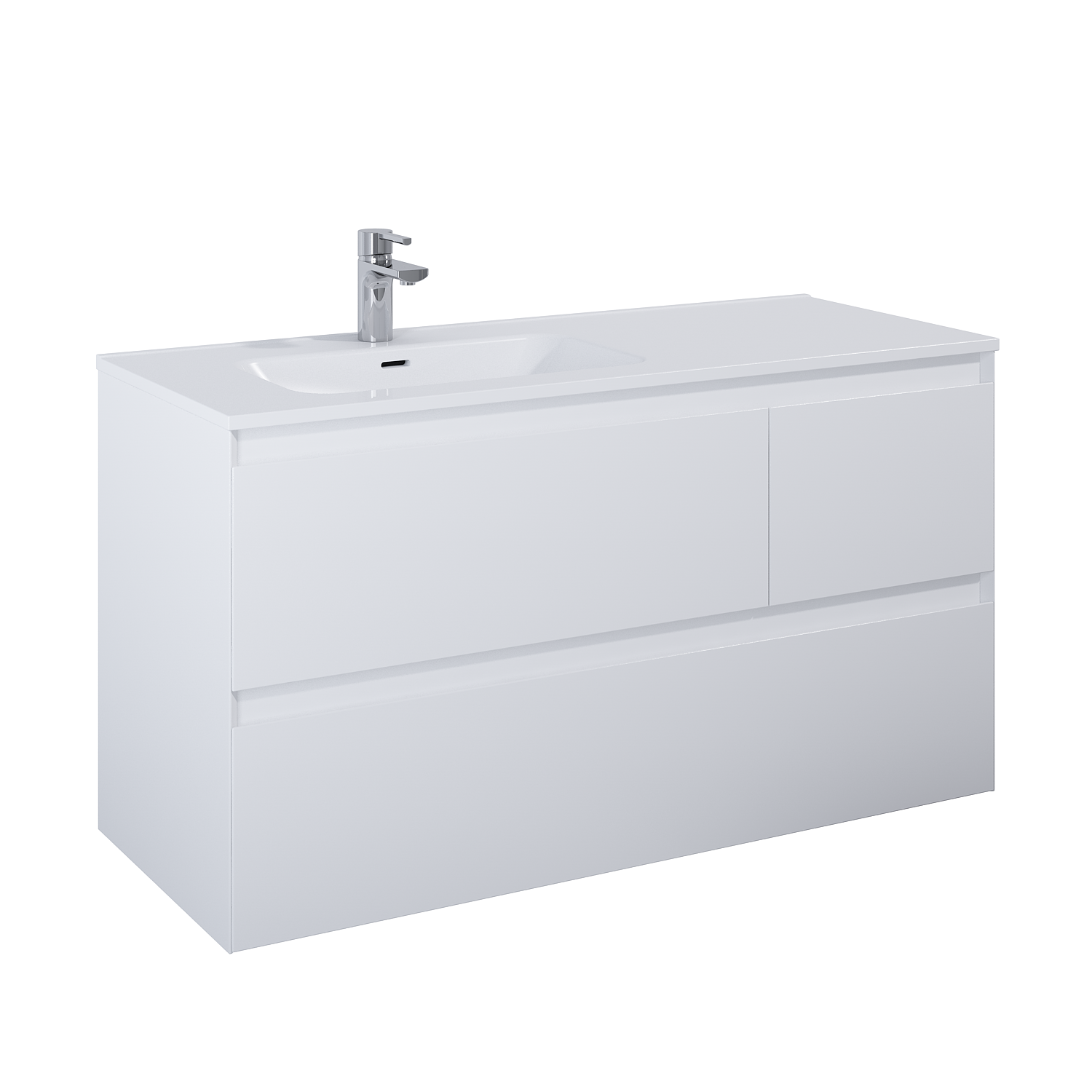Szafka podumywalkowa Split 120 cm, 3 szuflady z metalowymi bokami, z pełnym wysuwem i systemem system soft - close. Górne szuflady o asymetrycznym podziale – większa (80 cm), umieszczona z lewej strony. Szafka wykonana z materiałów wysokiej jakości, front i korpus z płyty laminowanej, lakierowanej w kolorze white matt. Frezowane uchwyty wyprofilowane pod kątem 45°. Szafka przystosowana do łączenia z blatami ElitStone.