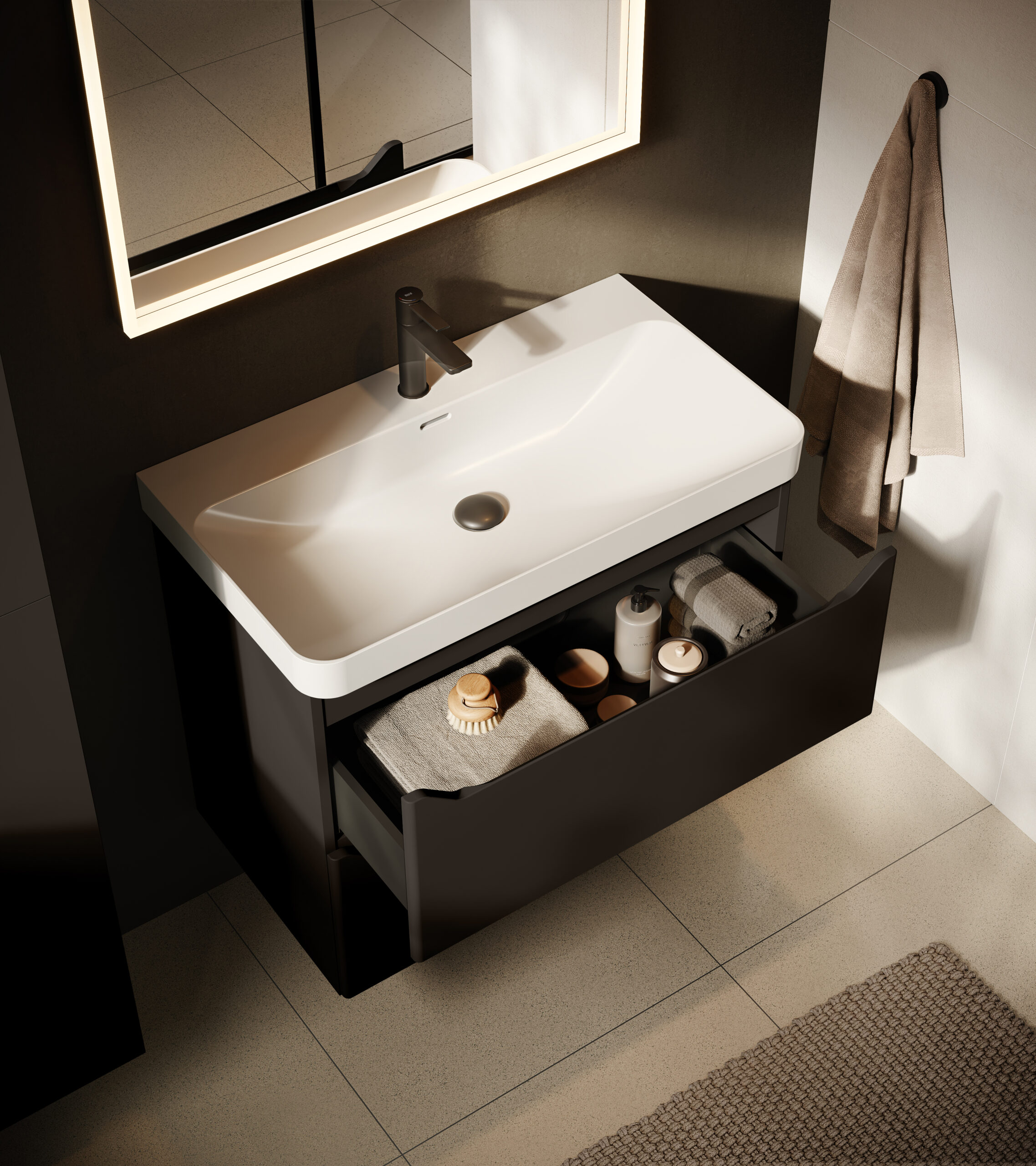 Komplet zawiera ceramiczną umywalkę oraz szafkę z dwiema pojemnymi szufladami. System cichego domykania i pełen wysuw zapewniają wygodę użytkowania oraz łatwy dostęp do przechowywanych rzeczy.