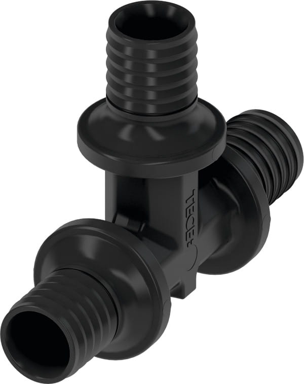 Trójnik z wysokowydajnego tworzywa PPSU Złączka optymalizująca opór przepływu (wartość Zeta) zarówno w obiegu jak i w odpływie. Do przyłączania tulei zaciskowej do rur TECEflex bez stosowania O-ringów. Bez tulei zaciskowych TECEflex.