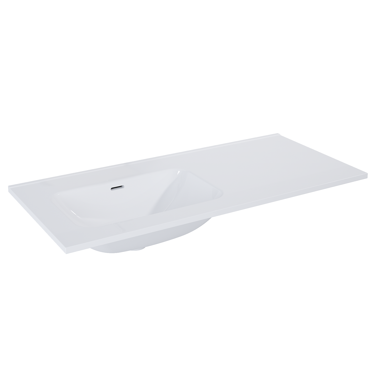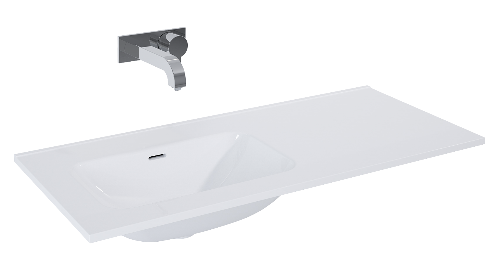 Umywalka meblowa Skappa 100 cm z wydłużonym blatem po prawej stronie. Nowoczesna umywalka ceramiczna z przelewem bez otworu na baterię, stworzona z myślą o armaturze podtynkowej. Umywalka produkowana w sposób tradycyjny, charakteryzuje się dużą wytrzymałością, odpornością na ścieranie oraz działanie czynników chemicznych.