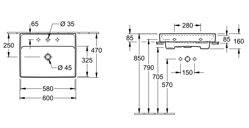 Collaro Umywalka 600 x 470 x 160 mm, Weiss Alpin CeramicPlus, z przelewem, Szlifowany